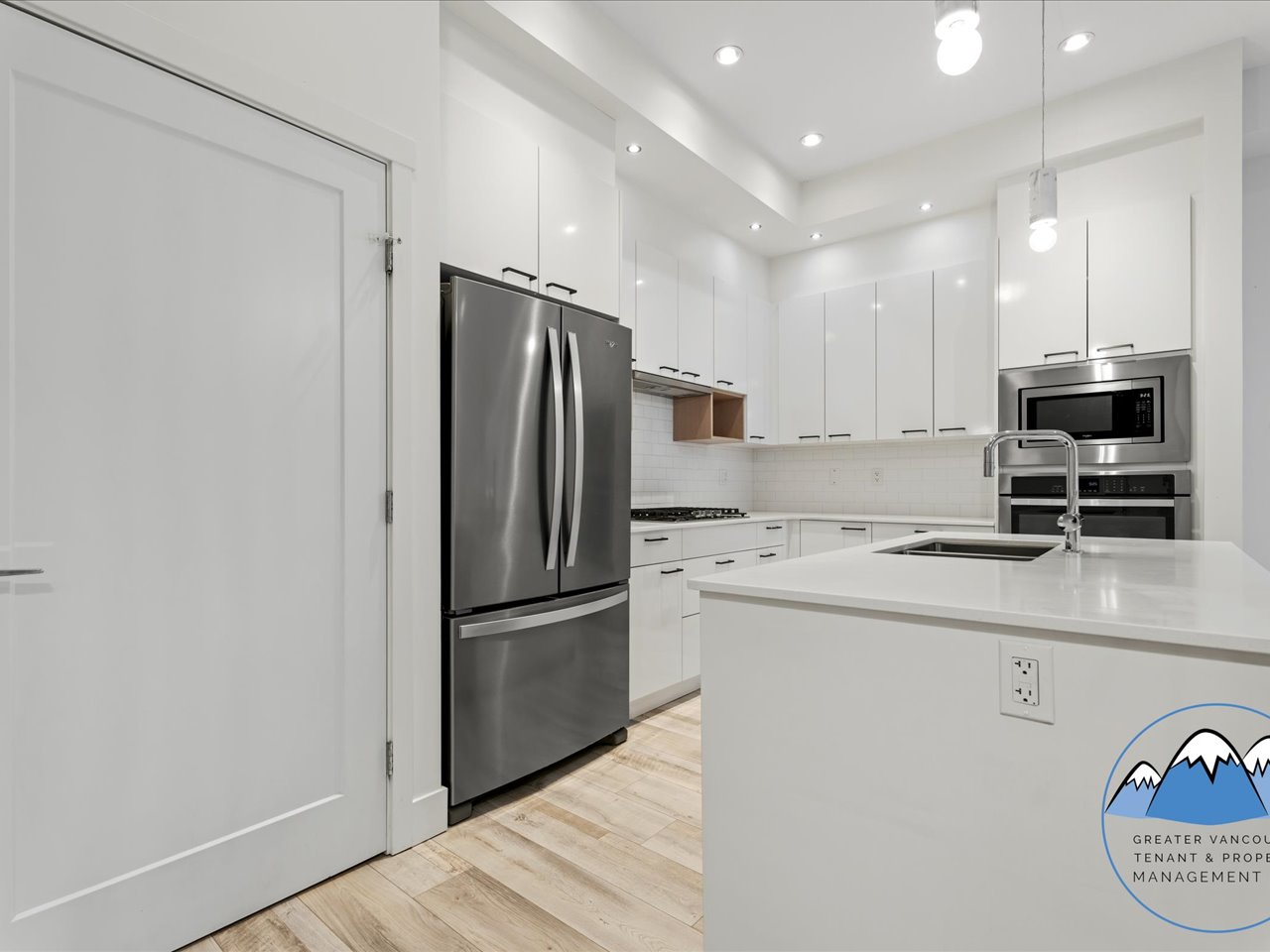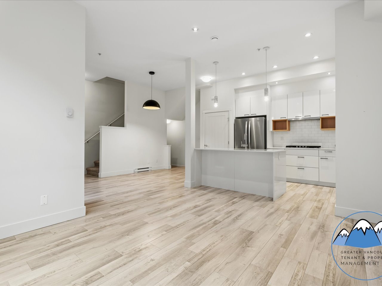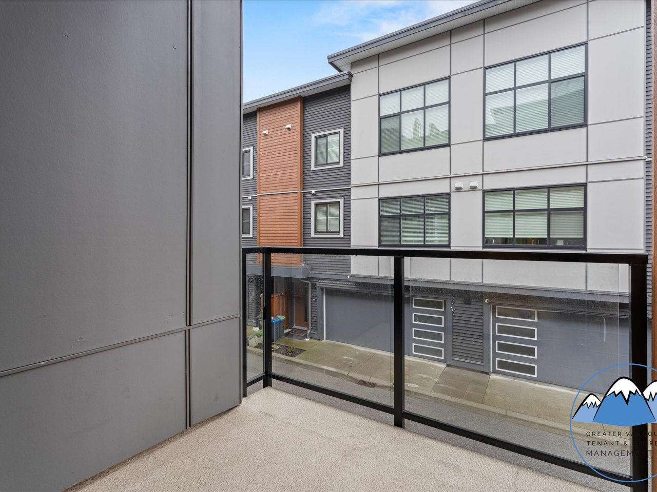 We are offering a bright and modern 2 bedroom / 3 bathroom townhouse featuring 1,261 sqft of living space across three levels. This contemporary home offers 10-foot ceilings, laminate flooring, and electric baseboard heating, creating a spacious and comfortable environment. The kitchen is equipped with fridge, stove, dishwasher, and microwave, and the home includes in-unit laundry for convenience. One of the bathrooms is an ensuite, and the primary bedroom features a walk-in closet. Outdoor living is a highlight of this home, with a large 385 sqft rooftop deck as well as an additional balcony, perfect for relaxing or entertaining.