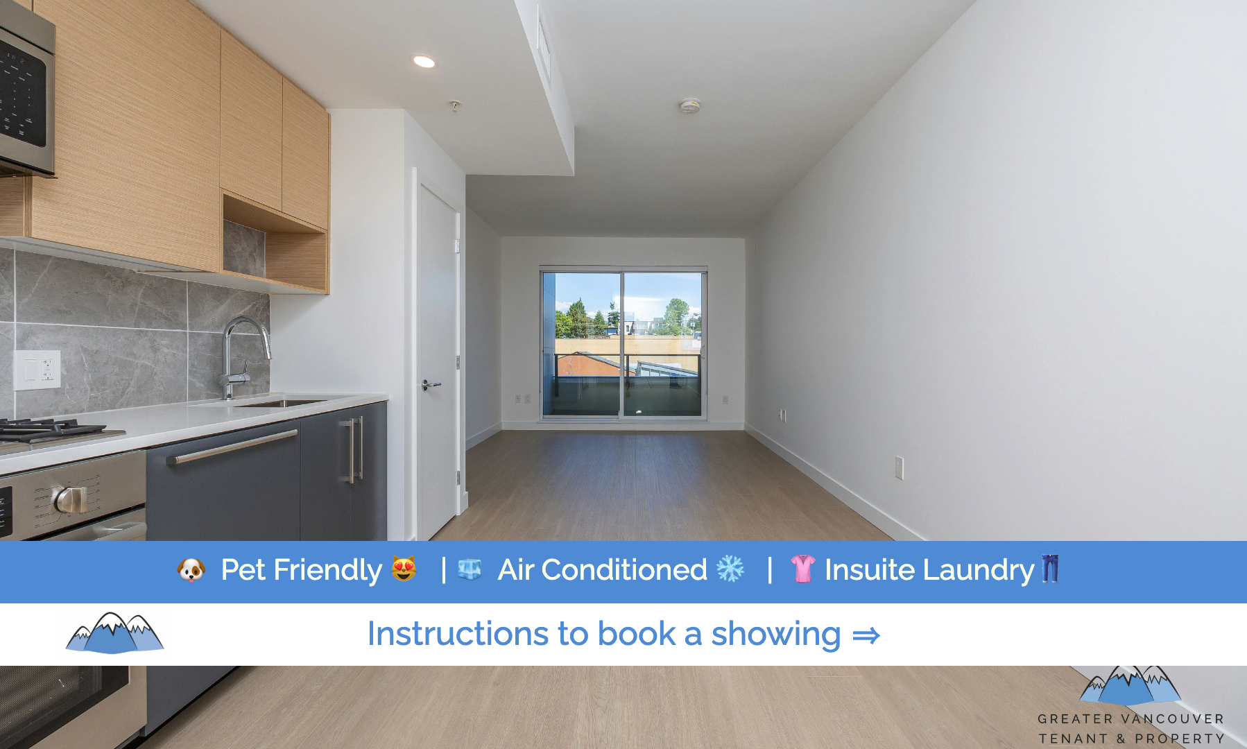 We are offering a studio/1 bathroom condo for rent in Vancouver. The home is located on the 3rd floor with a balcony. Other great features include kitchen appliances (fridge, gas stove, dishwasher, and microwave), air conditioning, laminate flooring, in suite washer & dryer, and approximately 400 square feet of living space. There is 1 parking spot available for $100/mo and storage locker included.