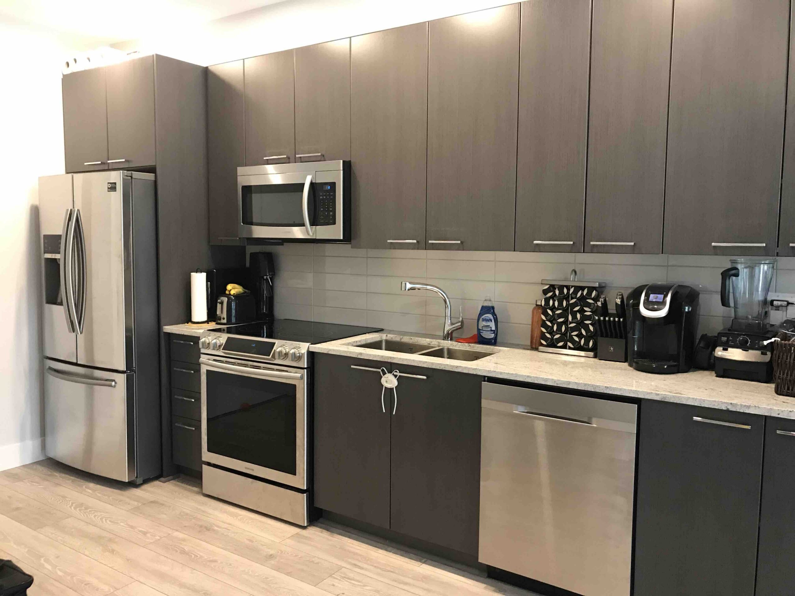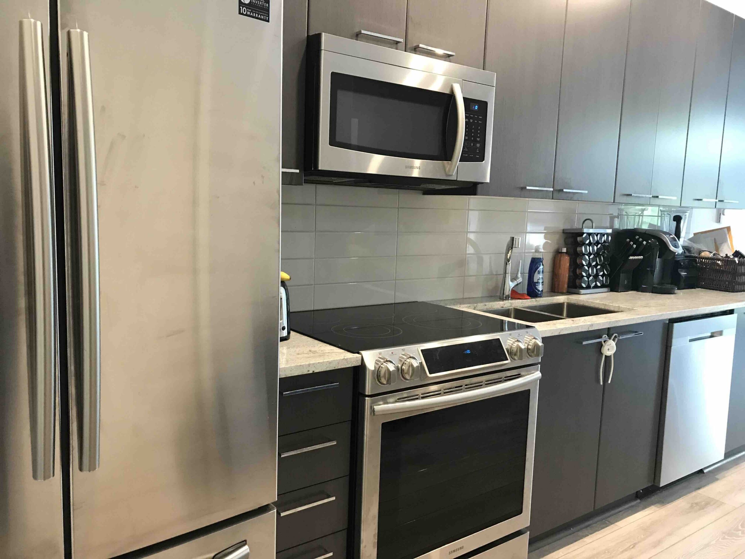 We are offering a modern 1 bedroom / 1 bathroom condo featuring approximately 600 sqft of well-designed living space. This unit includes in-suite laundry, air conditioning, and a private balcony. The kitchen is equipped with stainless steel appliances, including fridge, stove, and dishwasher, offering both style and functionality. The building is professionally managed and offers secured entry and a modern elevator system, providing both safety and convenience.
