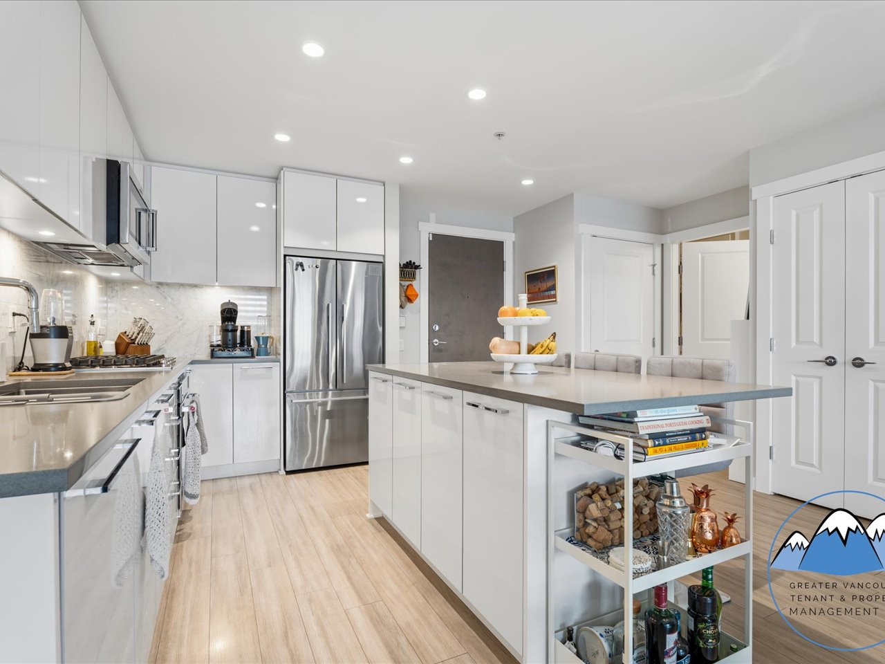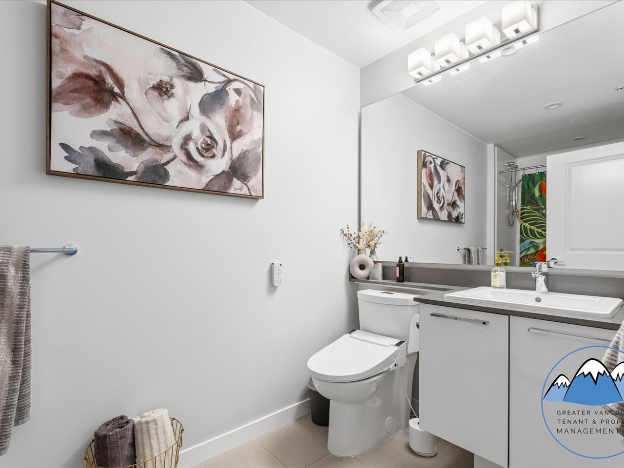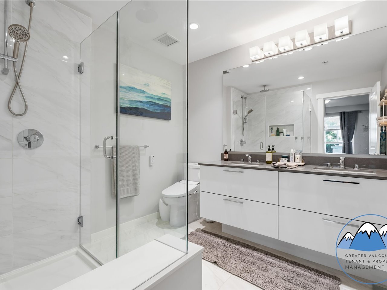 The kitchen is equipped with fridge, gas stove, dishwasher, and microwave, offering both functionality and contemporary finishes. The primary bedroom features a walk-in closet and an ensuite double sink bathroom with electronic bidet toilet for added convenience.