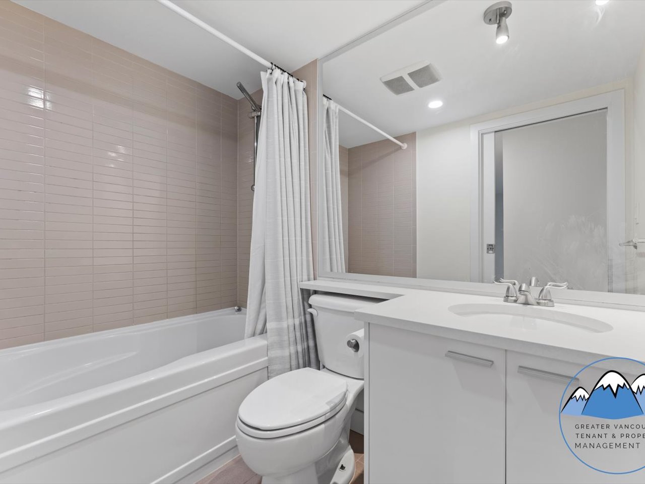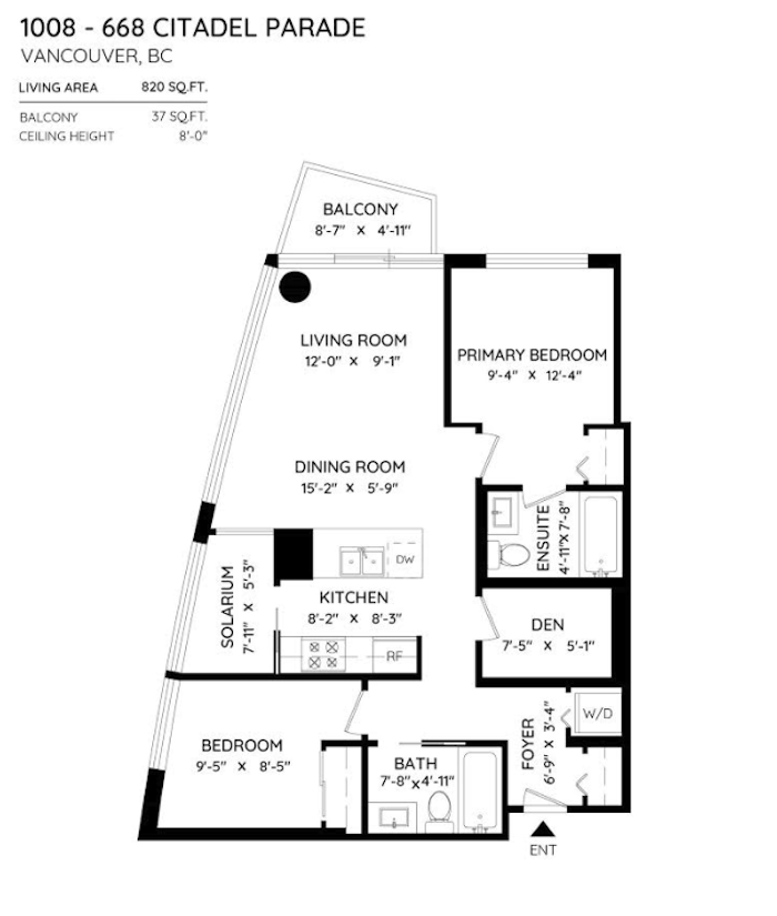 We are offering a bright 2 bedroom + den / 2 bathroom condo featuring 820 sqft of modern living space. This corner unit includes hardwood floors, a spacious balcony, and a solarium, providing both comfort and versatility. The kitchen is equipped with stove, fridge, dishwasher, and microwave, and the home includes in-unit laundry, 1 parking stall and access to building amenities: indoor pool, hot tub, sauna, and gym.